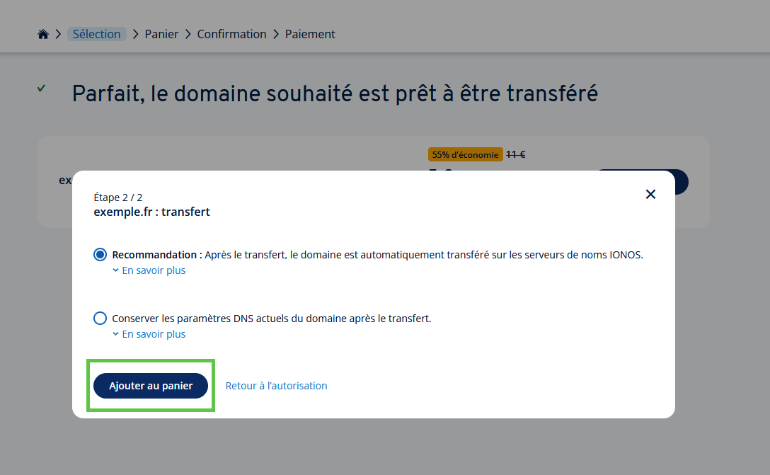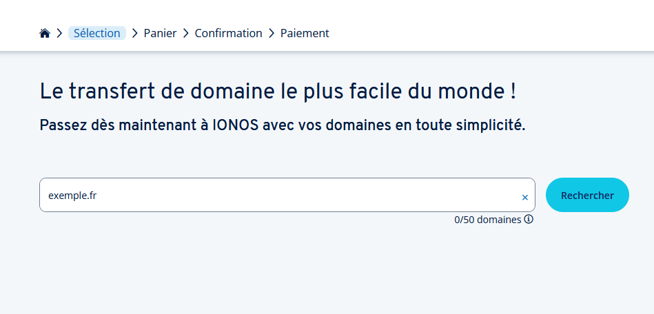 Une fois les préparatifs de transfert terminés, vous pouvez commencer votre transfert de domaine vers IONOS :