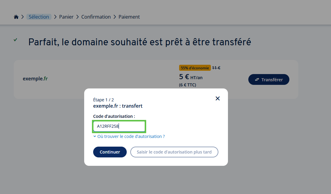 Préparer le transfert de domaine : Vous préparez votre domaine auprès de votre fournisseur actuel pour le transfert de domaine et vous récupérez le code d'autorisation.