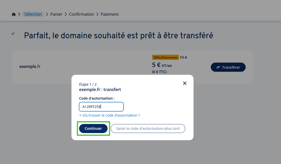 - Saisissez le code d'autorisation que vous avez récupéré auprès de votre fournisseur actuel pour votre domaine et cliquez sur Continuer.