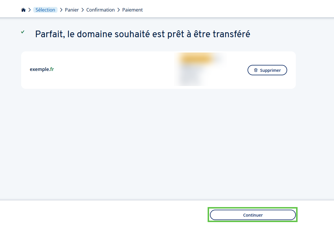 Pour finaliser la commande et commencer le transfert du domaine, cliquez sur Acheter.