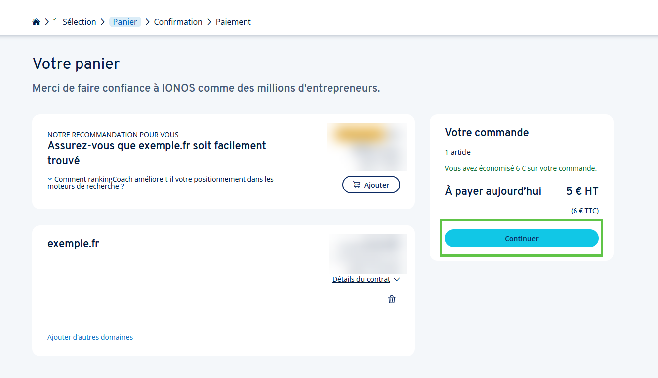Cliquez sur Continuer. Vous serez redirigé vers la page Votre panier.