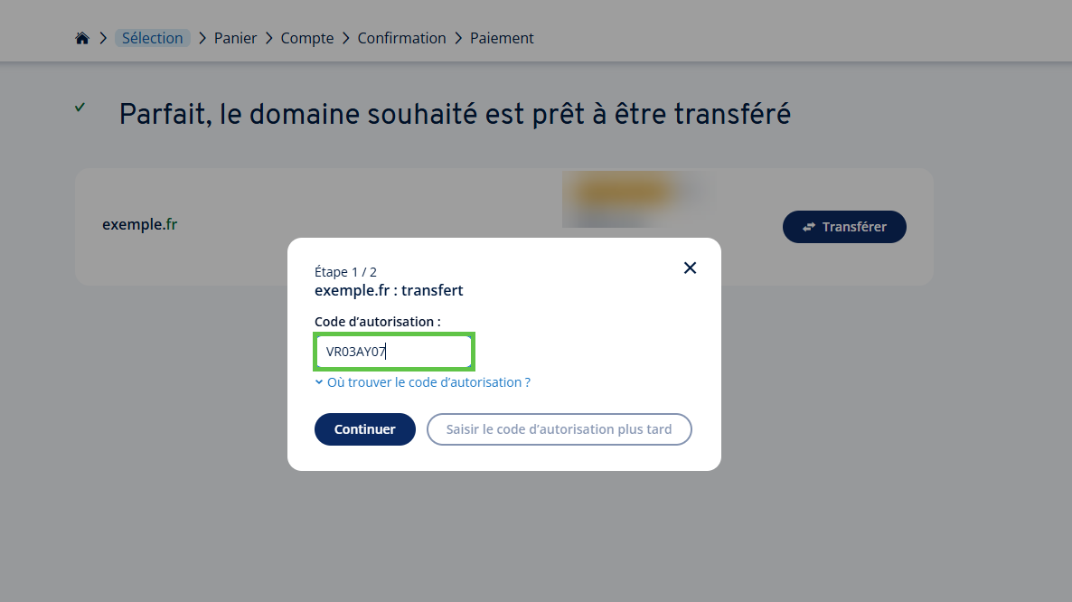 Préparer le transfert de domaine : Vous préparez votre domaine auprès de votre fournisseur actuel pour le transfert de domaine et vous récupérez le code d'autorisation.