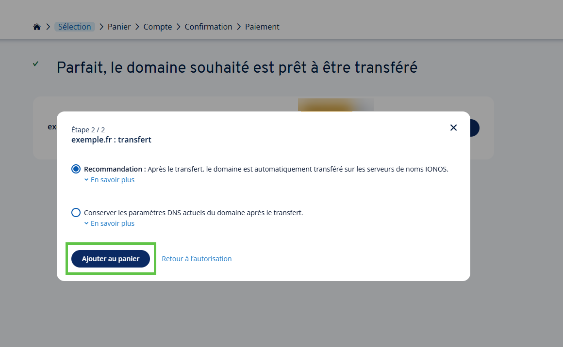 Votre domaine va maintenant être transféré dans votre nouveau contrat IONOS. Nous vous enverrons par e-mail toutes les informations concernant votre commande et le transfert de votre domaine.