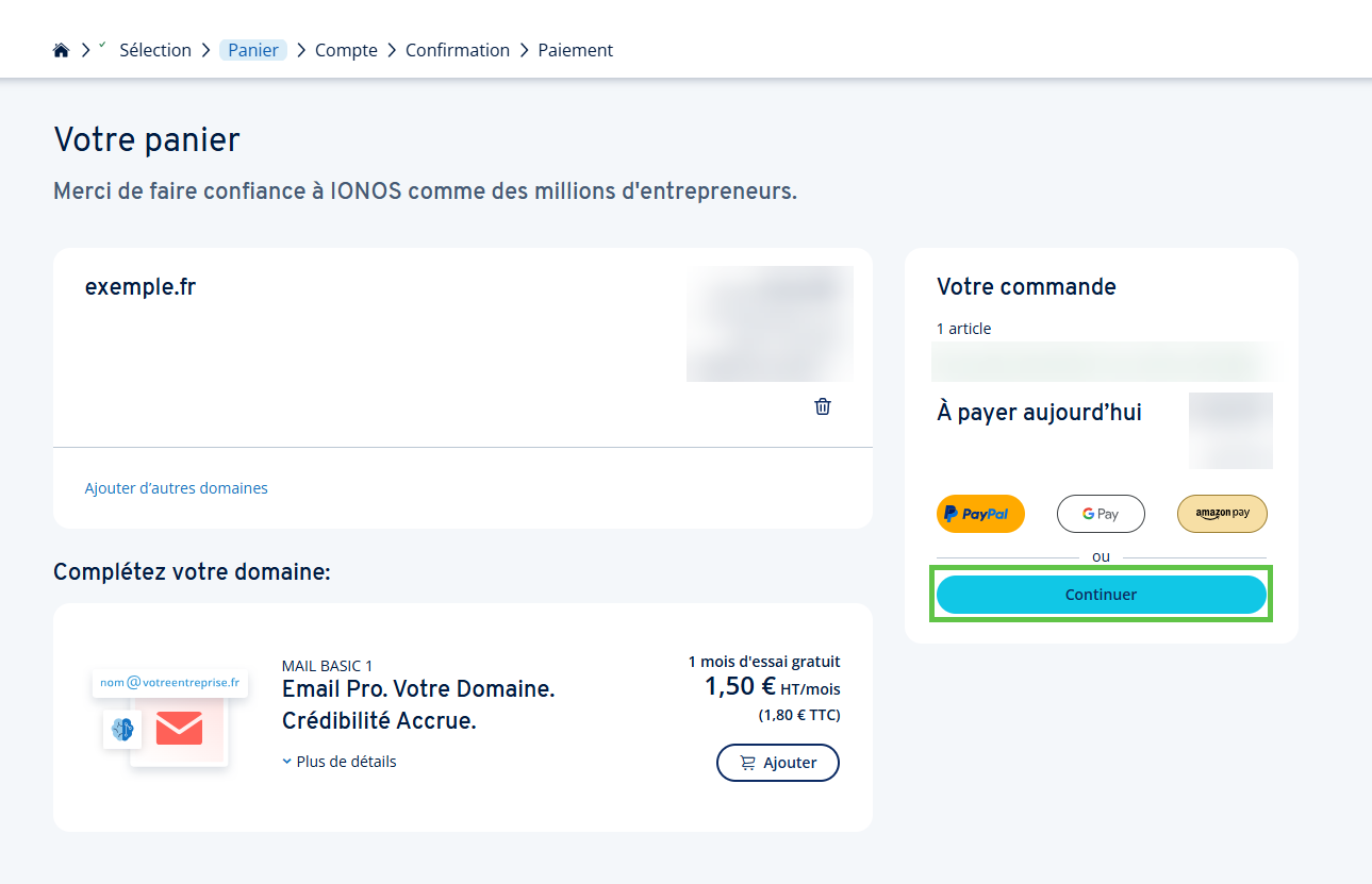 - Cliquez sur Continuer. Vous serez redirigé vers la page Panier.
