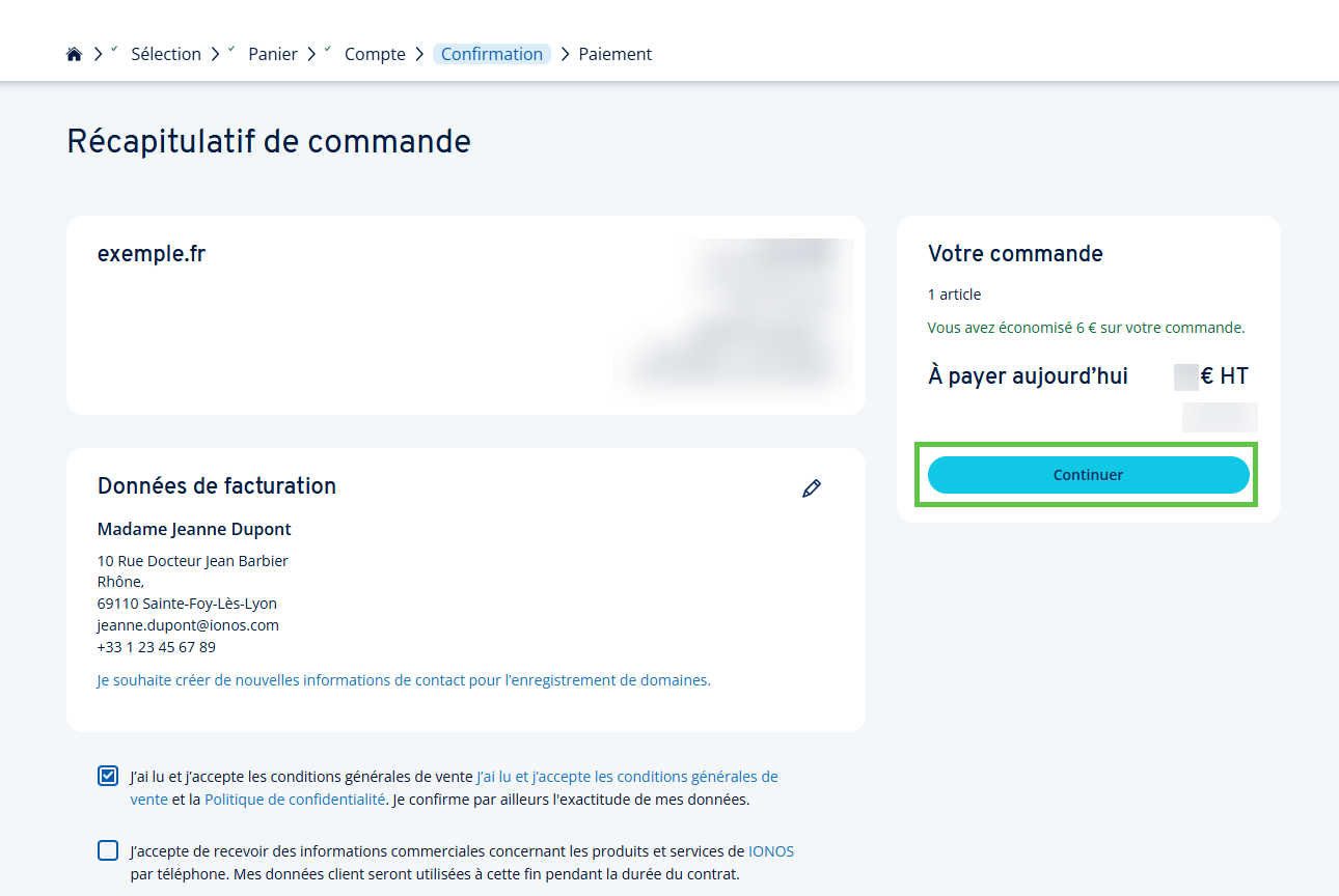 - Cliquez sur Continuer. Vous serez redirigé vers la page Récapitulatif de commande.
