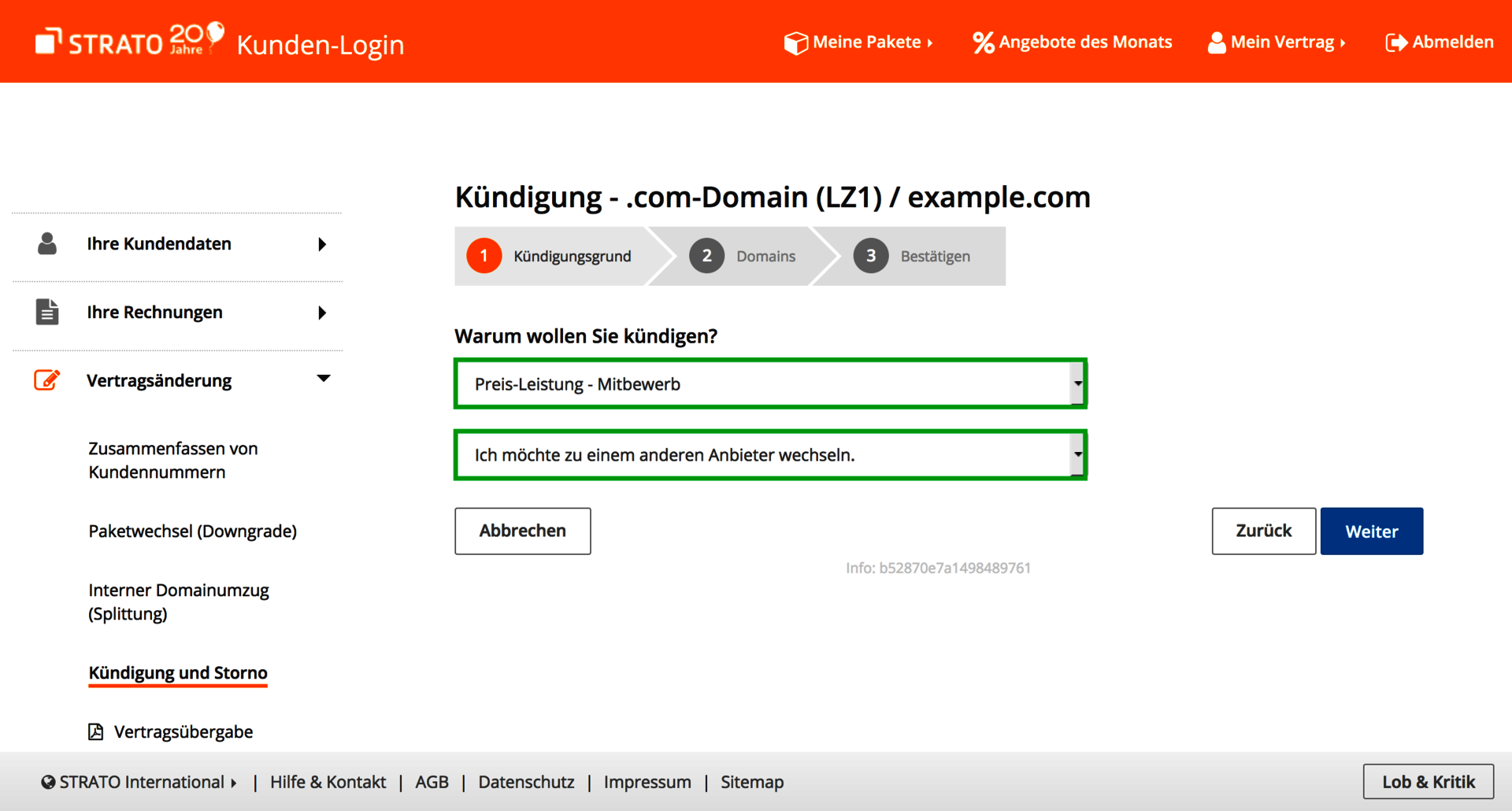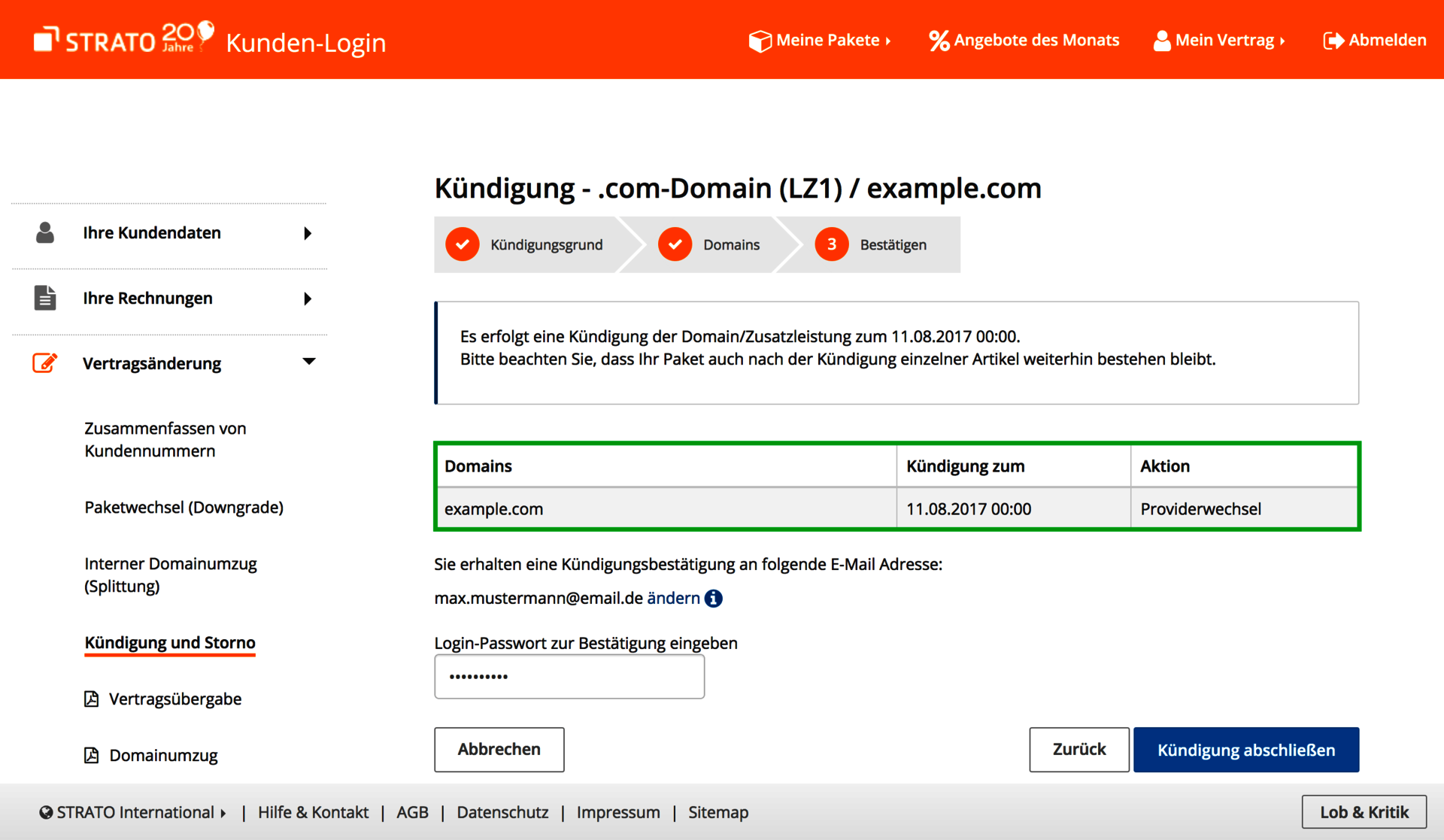 Avec STRATO, vous devez résilier le domaine dans la première étape afin de recevoir le code d'autorisation - également connu sous le nom de AuthCode chez STRATO - pour le transfert de votre domaine plus tard.