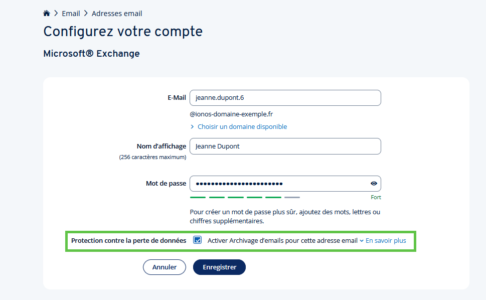 Le compte Microsoft Exchange est créé et l'archivage des emails est automatiquement activé pour ce compte.