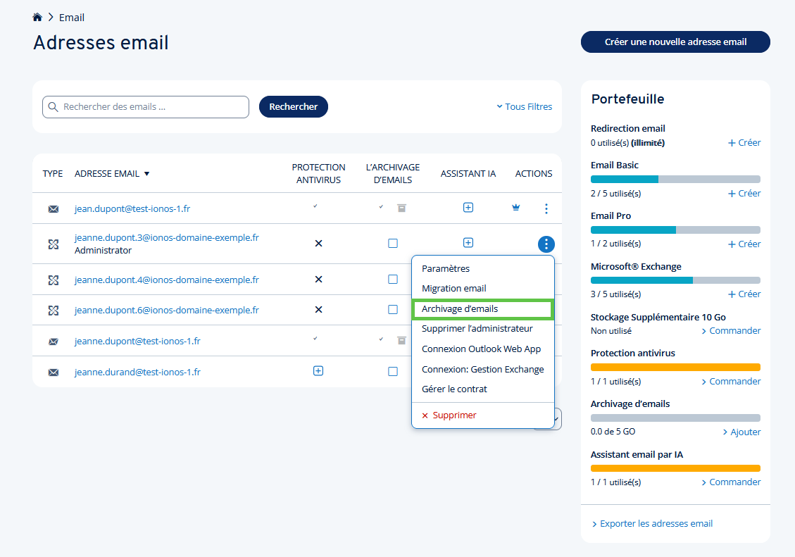 À côté de l'adresse email souhaitée, dans la colonne Actions, cliquez sur l'engrenage. Cliquez ensuite sur Archivage d'emails.