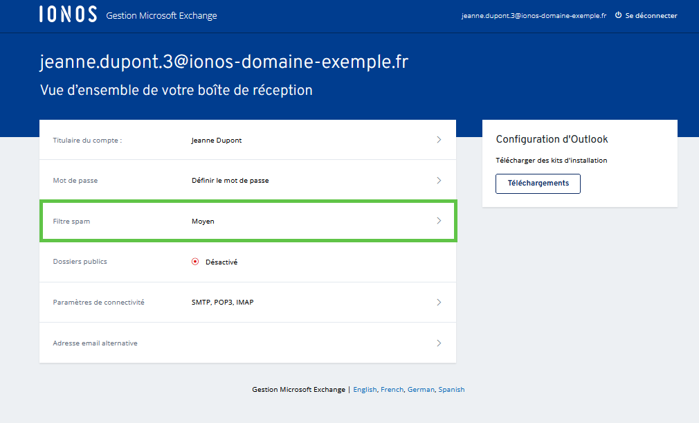 Dans le dossier Courrier indésirable de votre programme de messagerie, par exemple Outlook, vous trouverez les e-mails identifiés comme spam de votre compte Microsoft Exchange. Vous pouvez facilement configurer le niveau de sensibilité pour la détection des e-mails indésirables via votre Gestion Microsoft Exchange. Pour configurer les paramètres de spam, procédez comme suit :
