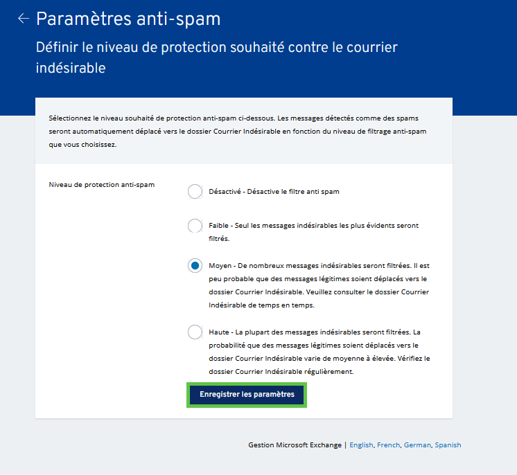 Sélectionnez le niveau de protection anti-spam souhaité (Désactivé / Faible / Moyen / Haute).