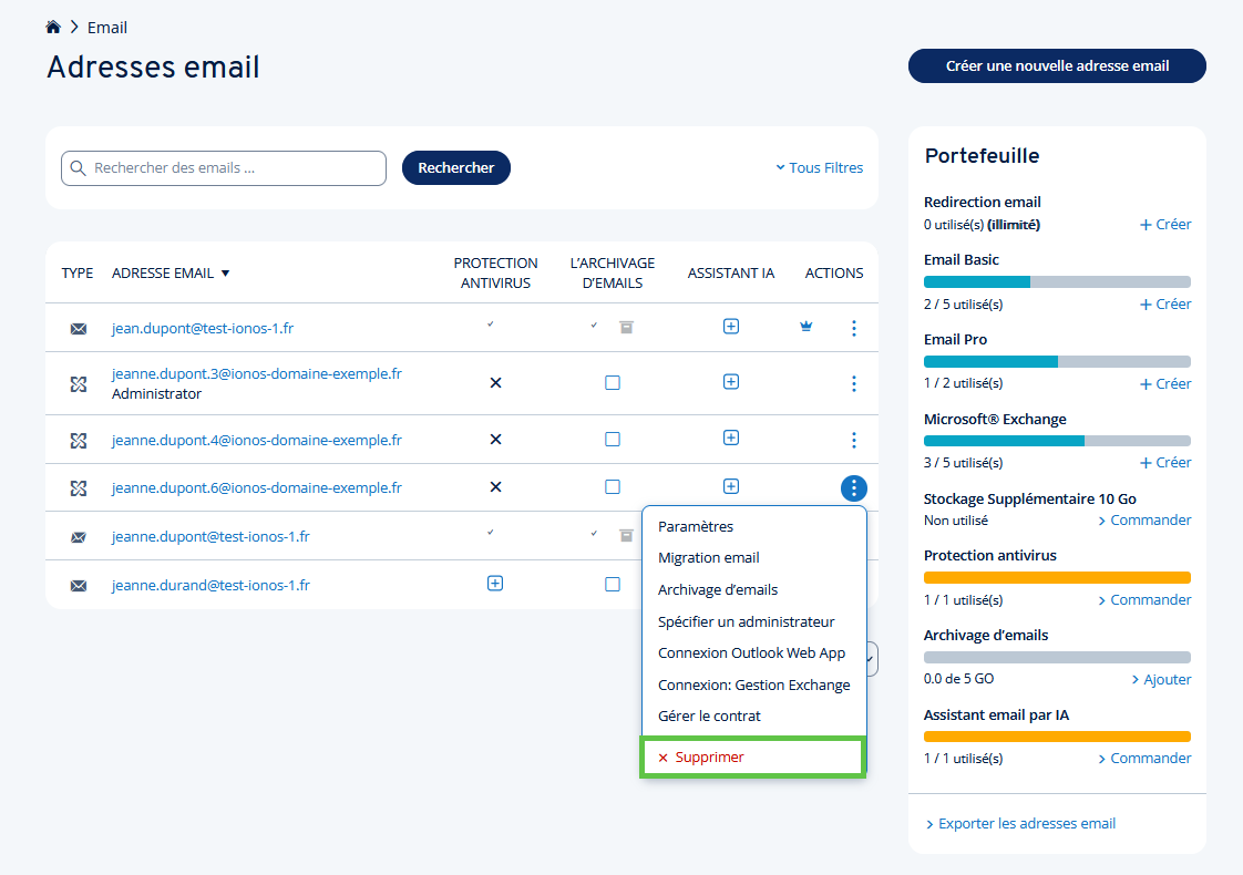 Dans la ligne de l'adresse e-mail souhaitée, sous la colonne Actions, cliquez sur l'icône représentant une roue dentée, puis sur Supprimer.