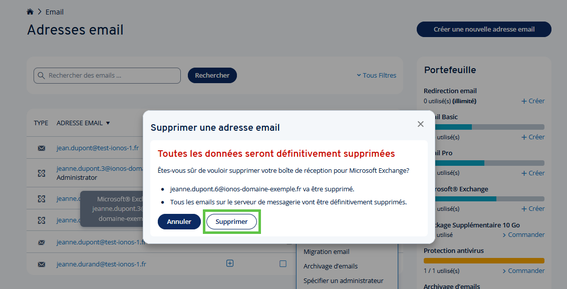 Confirmez la suppression de l'adresse e-mail en cliquant à nouveau sur Supprimer.