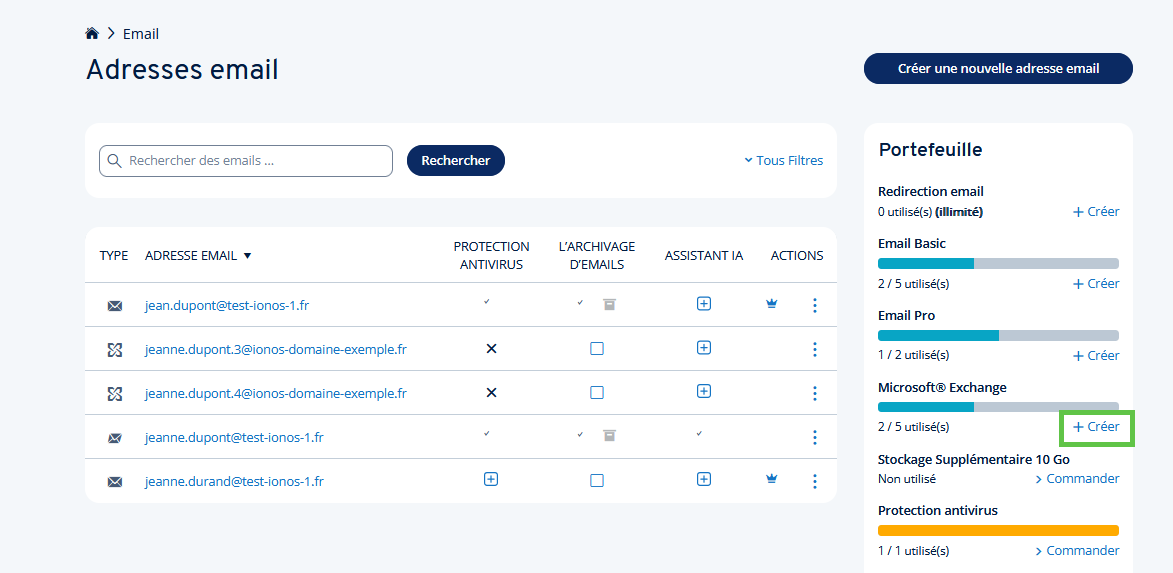 Sur la droite, dans la section Portefeuille, sous Microsoft Exchange, cliquez sur +Créer.