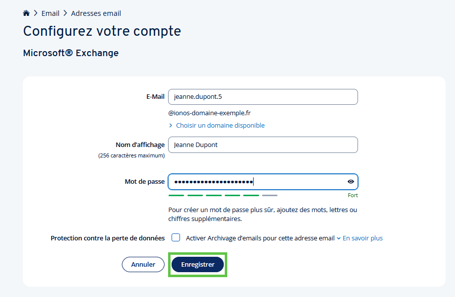Saisissez l'adresse e-mail souhaitée, le nom d'affichage et le mot de passe, puis cliquez sur Enregistrer.