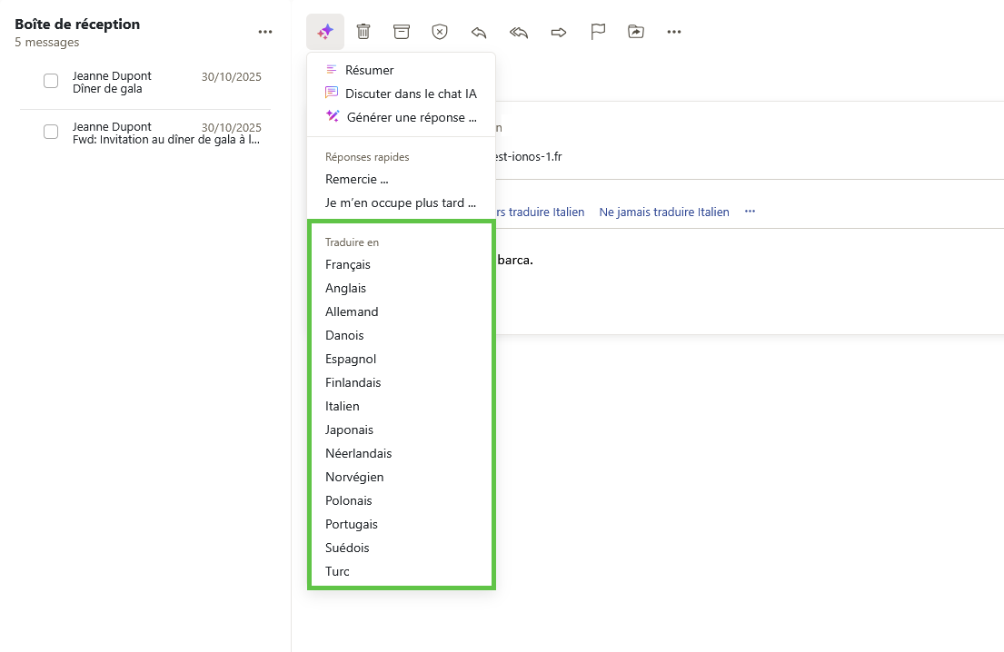 Webmail : Traduire des textes avec Assistant email par IA