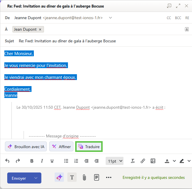 La traduction générée par l'IA s'affiche dans l'e-mail.