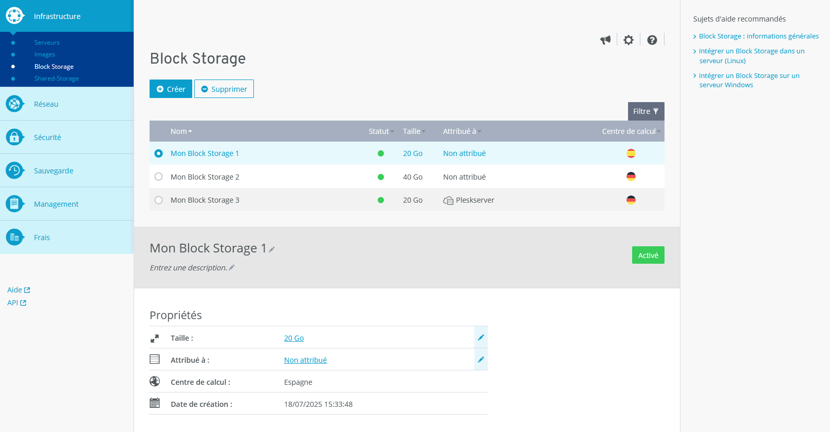 Description : Description du Block Storage. Vous pouvez à tout moment modifier la description.