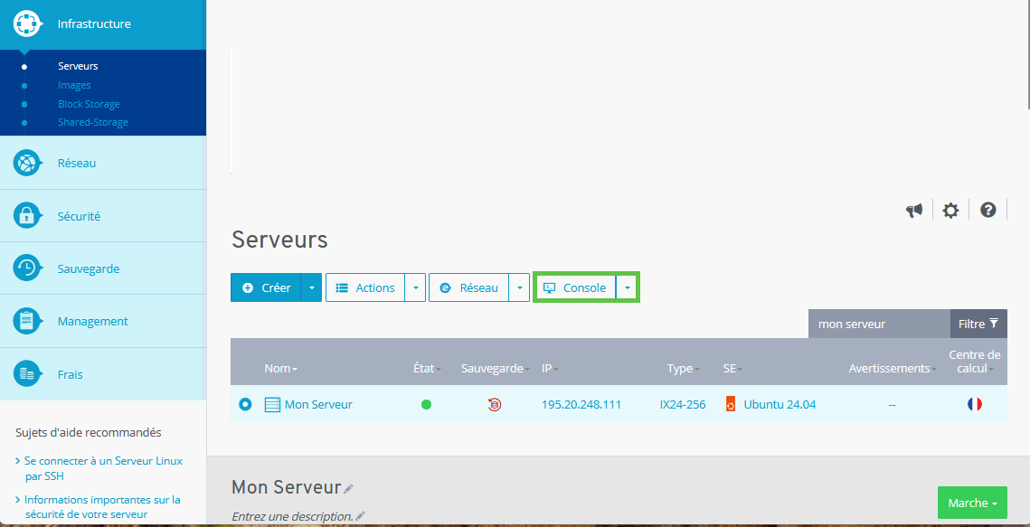 Pour les serveurs de type ###DEDICATED_SERVER## et Bons Plans Serveurs gérés depuis le Cloud Panel