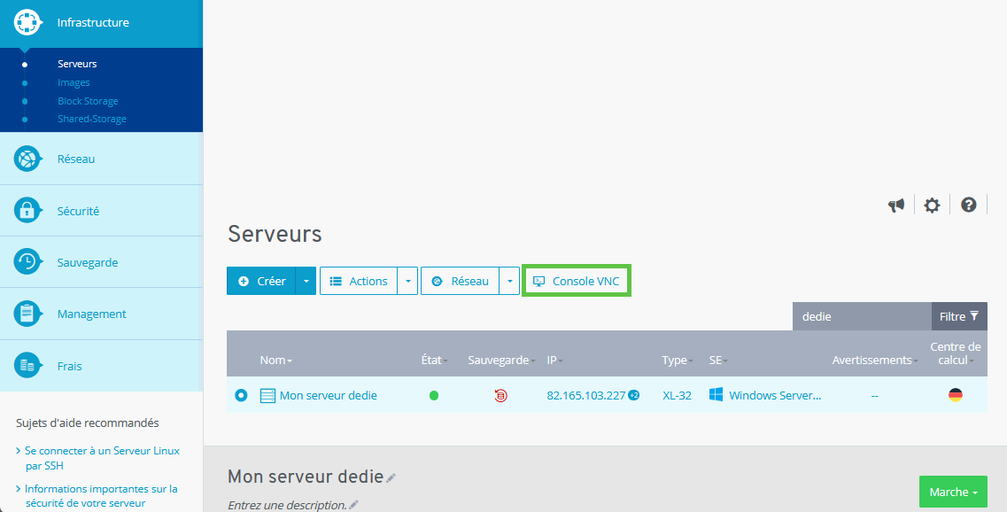 Utiliser la console VNC pour accéder au serveur (Serveur Dédié)