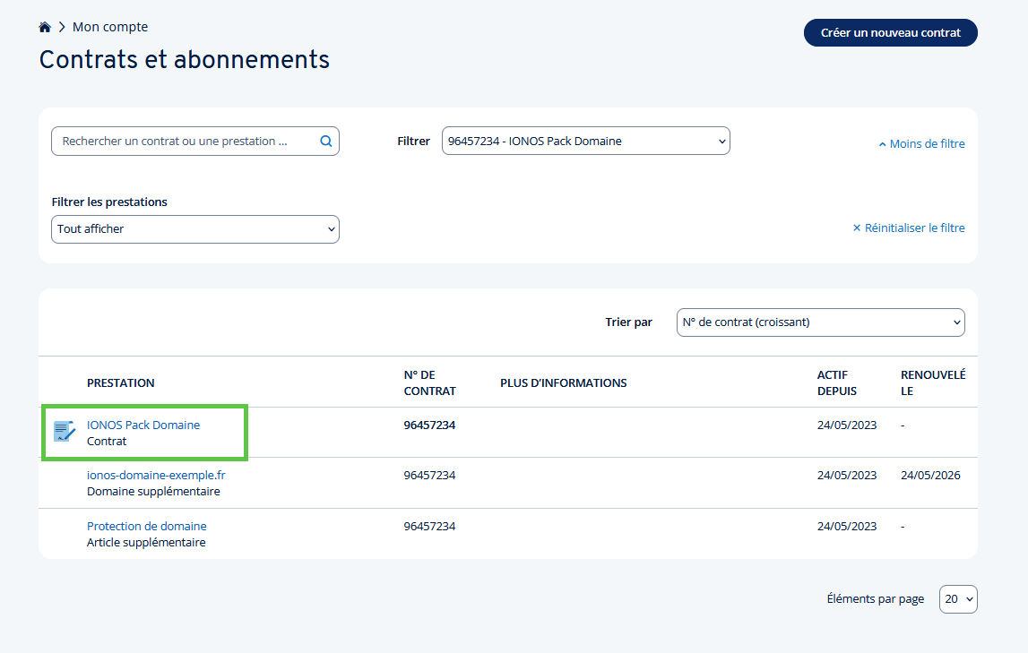 - Dans la colonne Prestation, cliquez sur le nom du contrat que vous souhaitez résilier.