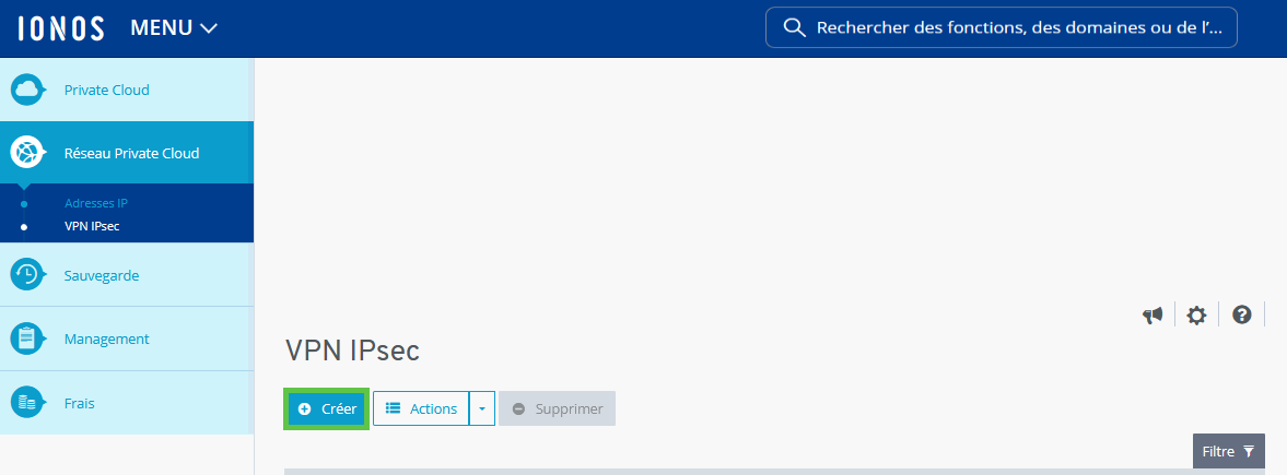 - Dans la barre de navigation à gauche, cliquez sur Réseau Cloud privé > VPN IPsec. La section VPN IPsec s'affiche.