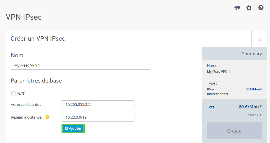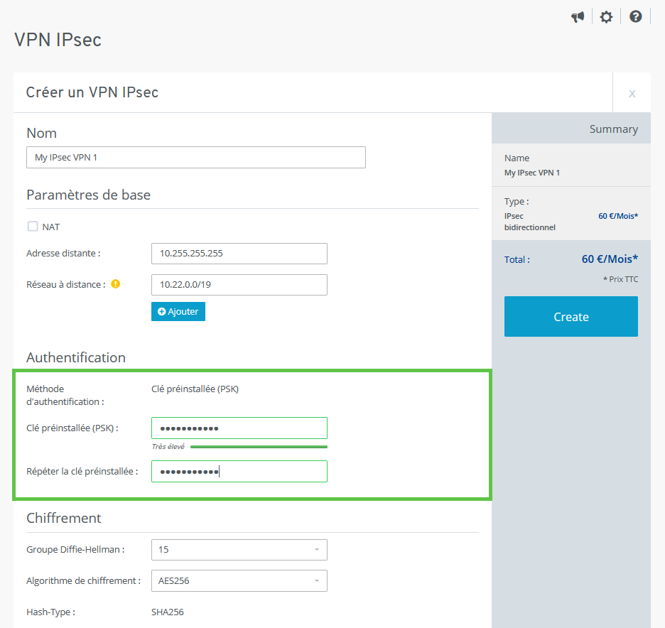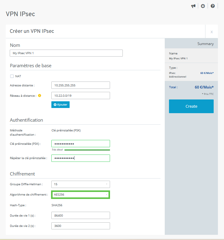 - Cliquez sur Créer. La zone Créer un VPN IPsec s'affiche.
