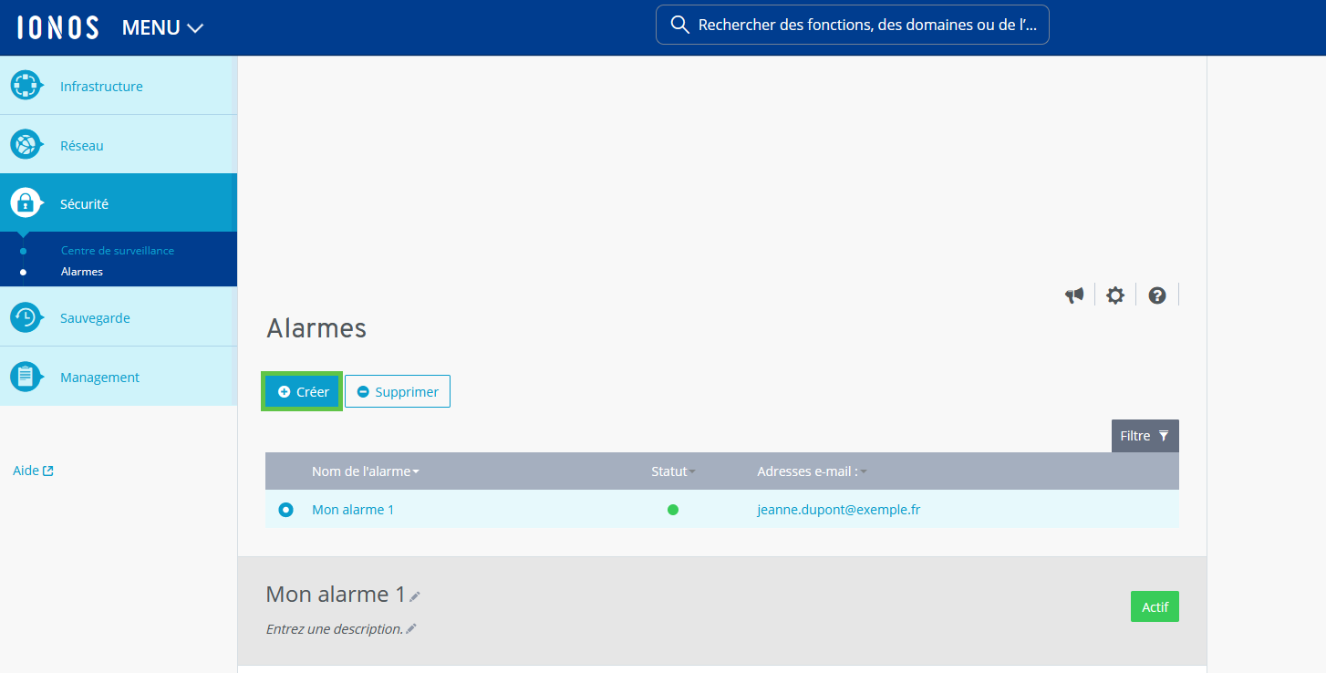 - Pour ouvrir la section Alarmes : dans la barre de navigation à gauche du Cloud Panel, cliquez sur Sécurité > Alarmes. La section Alarmes s'ouvre.
