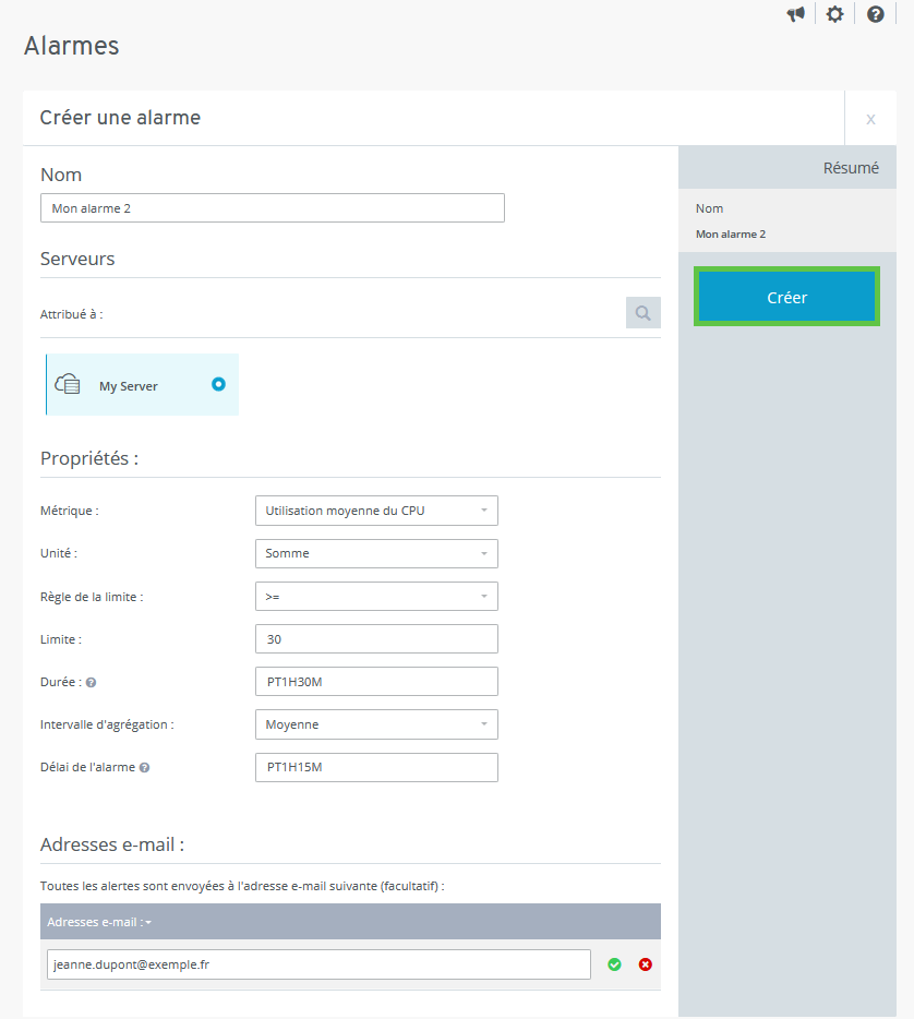 - Cliquez sur le bouton Créer. La zone Créer une alarme s'ouvre.