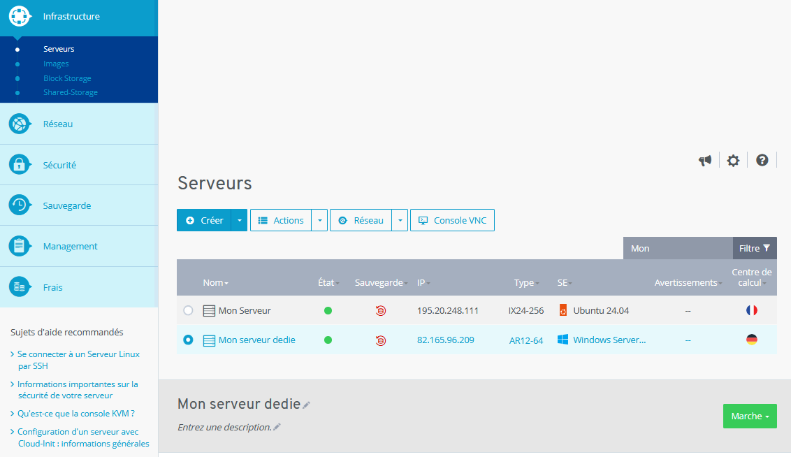 - Dans la section Infrastructure > Serveurs, cliquez sur le serveur souhaité.