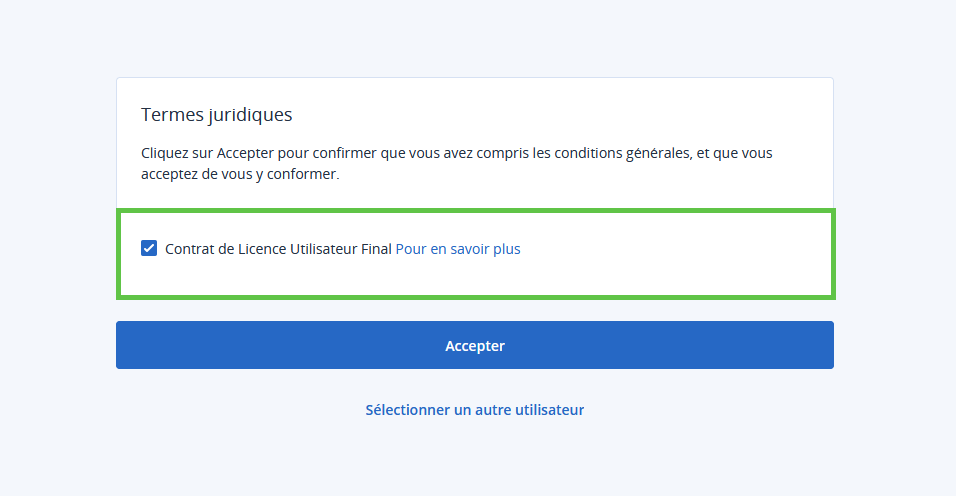 La première fois que vous accédez à l'interface d'administration, la page Termes juridiques s'affiche. Acceptez le contrat de licence pour utilisateur final.