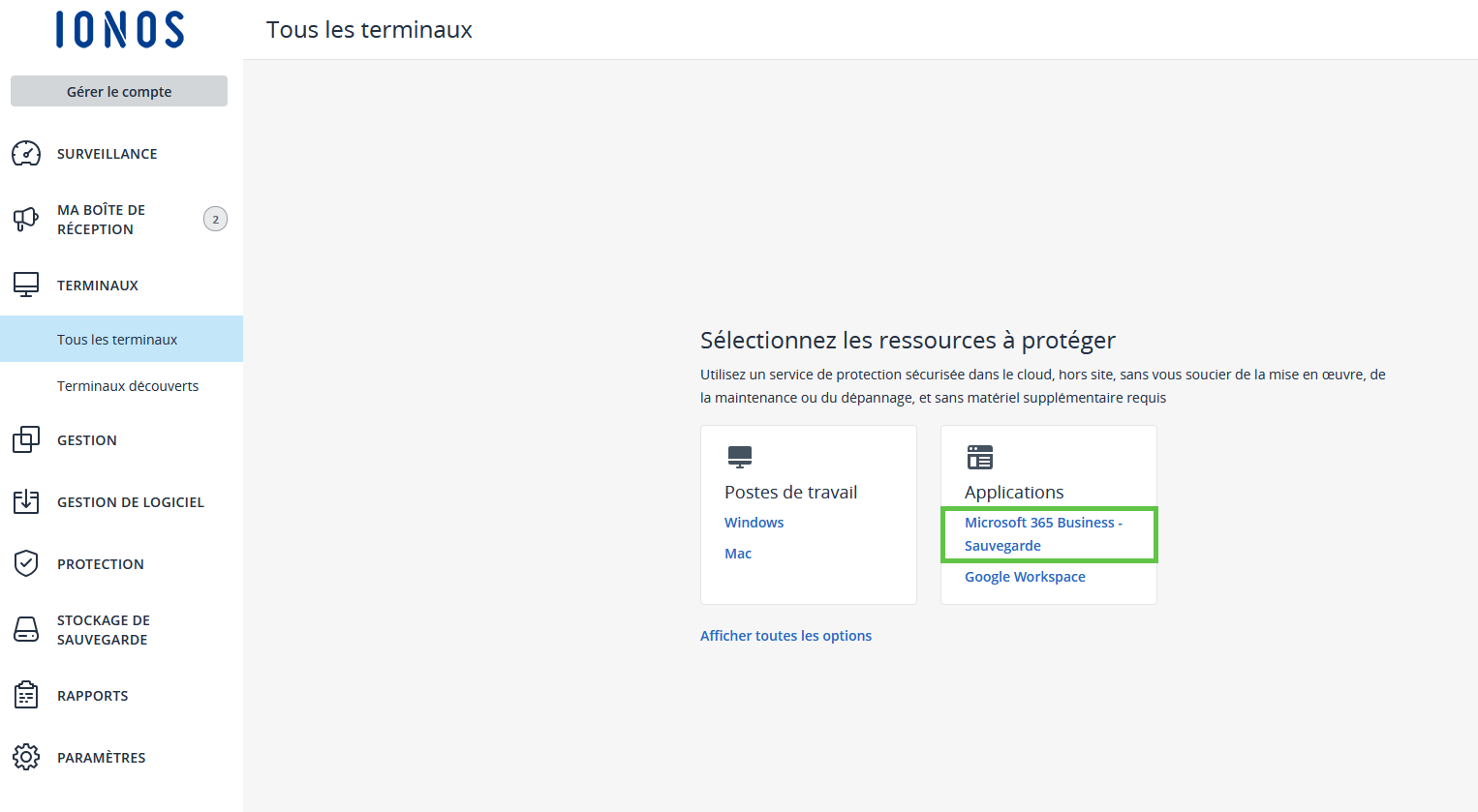 - Dans la barre de navigation à gauche, cliquez sur Terminaux > Microsoft 365.