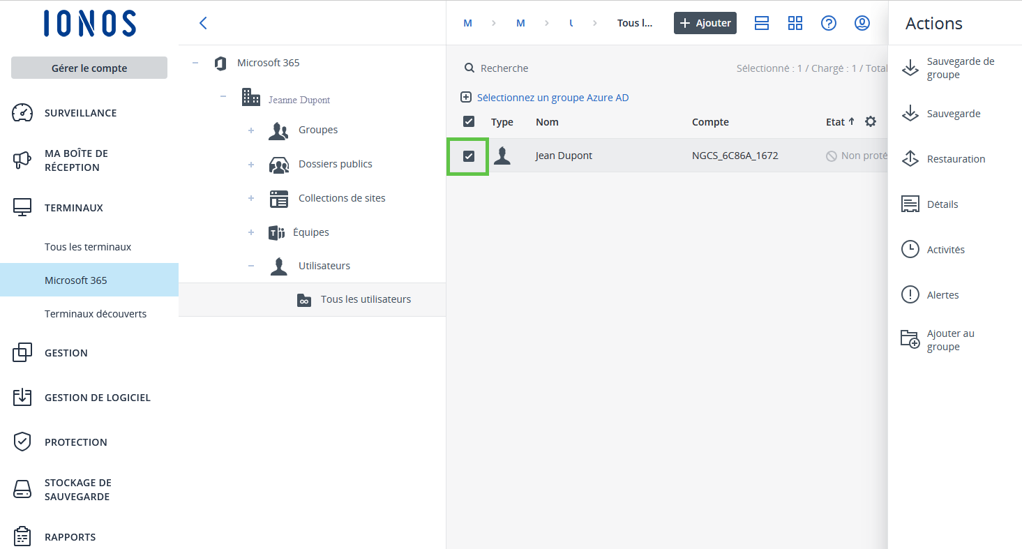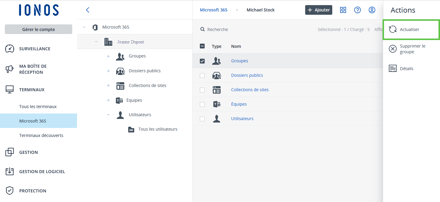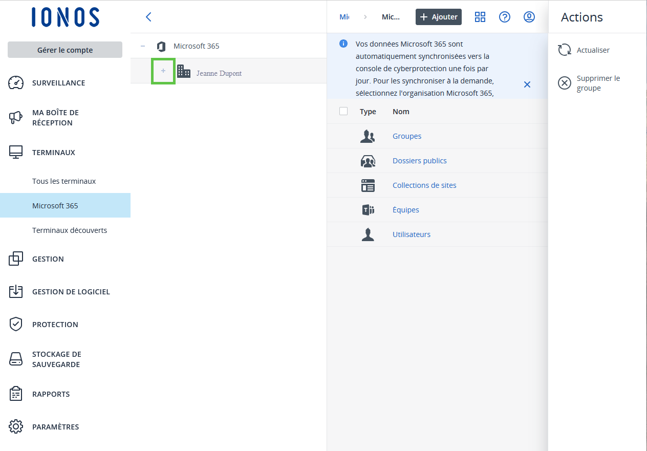 Si vous configurez d'autres comptes Microsoft 365 dans votre compte IONOS, ils seront automatiquement synchronisés une fois par jour avec l'interface d'administration de MyDefender. Pour déclencher manuellement la synchronisation, procédez comme suit :