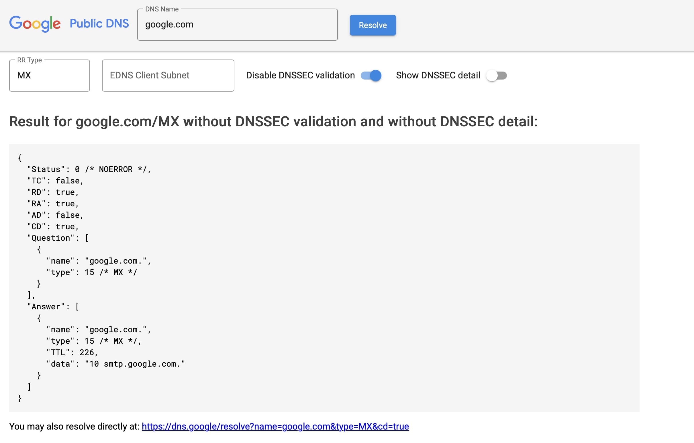 Pour procéder à une recherche d’enregistrements MX, vous pouvez recourir à différents services en ligne. Le service Public DNS de Google constitue une option facile à utiliser. Sur la page d’accueil, il vous suffit d’indiquer le nom du domaine dont vous souhaitez connaître les records MX. Sur la page suivante, modifiez le type d’enregistrement de A à MX. Il est inutile de modifier les options EDNS Client Subnet et DNSSEC. La première de ces options permet d’accélérer la recherche des informations DNS. La deuxième option garantit le fait que les données n’ont pas été manipulées par une tierce partie à des fins criminelles.