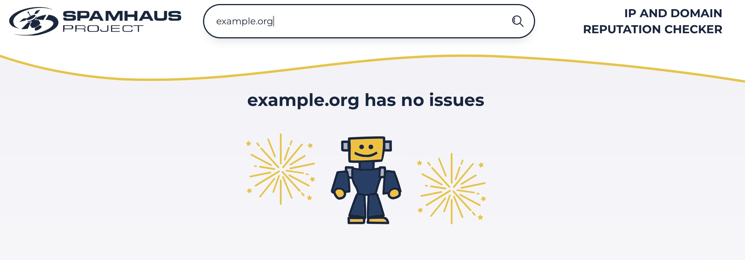 Si vous cliquez ensuite sur le bouton «Lookup », l’outil recherche dans la base de données « Domain Block List » créée par Spamhaus Project, qui contient une liste des domaines de spam connus. En quelques secondes, vous recevrez une notification vous indiquant si votre adresse figure ou non dans la base de données.