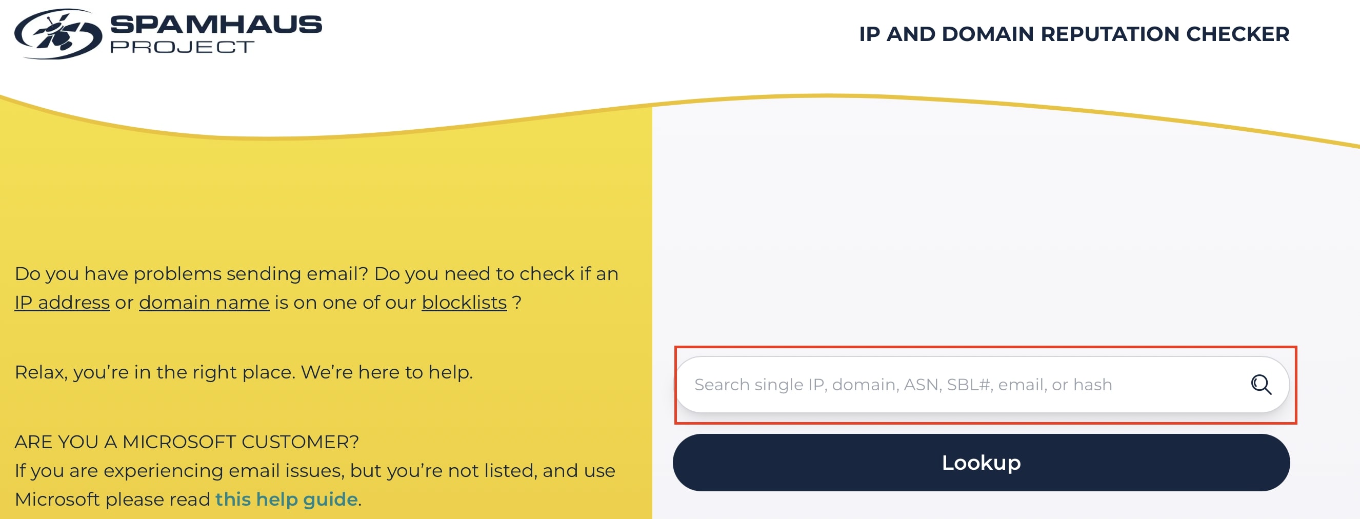Si c’est le cas, vous pouvez le découvrir à l’aide d’outils tels que Blocklist Removal Center de Spamhaus : accédez à cet effet l’application Web et entrez votre adresse email dans le champ prévu à cet effet.