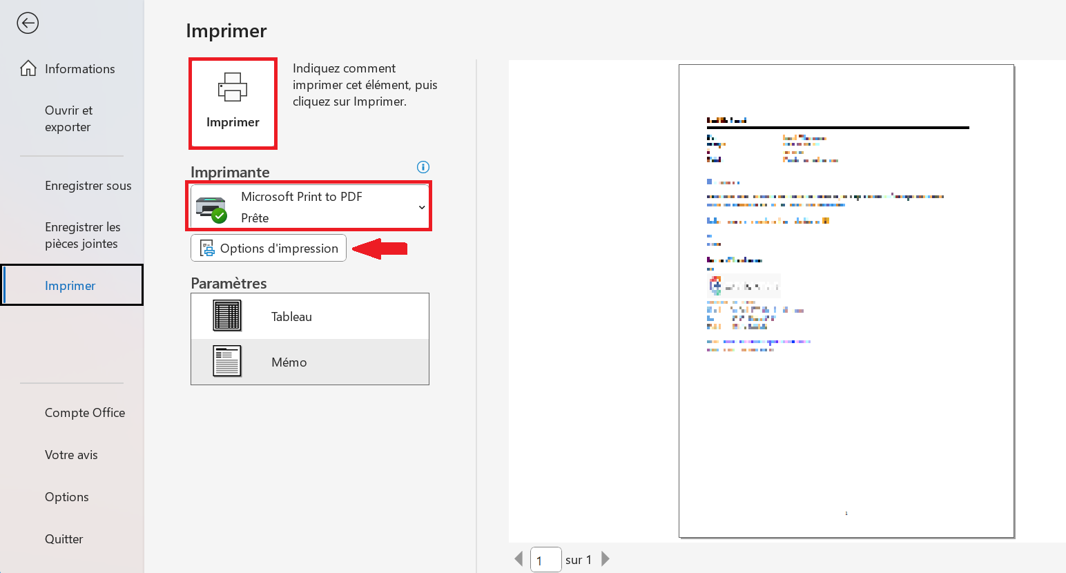 Étape 2 : si vous avez cliqué sur « Fichier » en haut à gauche, vous accédez à la fenêtre « Informations sur le compte ». Cliquez sur « Imprimer » dans la barre latérale gauche ; une nouvelle fenêtre s’ouvre alors avec un aperçu avant impression dans la partie droite de l’écran. Pour l’imprimer, cliquez sur le bouton « Imprimer ». En dessous de ce symbole, vous pouvez sélectionner au préalable votre imprimante. Dans les zones « Options d’impression » et Paramètres, il est possible d’effectuer d’autres réglages pour l’impression de votre email Outlook.