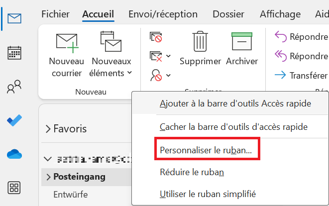 Pour que la commande « Imprimer » apparaisse également lorsque vous ouvrez un email dans sa propre fenêtre, vous devez répéter cette opération dans le ruban de menu et régler le paramétrage pour les emails ouverts individuellement.