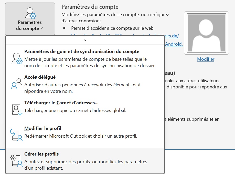 Pour configurer ou modifier le serveur SMTP dans Outlook, ouvrez dans un premier temps le client email de Microsoft, puis accédez à l’onglet « Fichier ». Ensuite, sélectionnez « Paramètres du compte » et « Gestion des profils ».