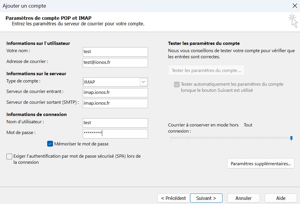 Sous « Serveur sortant », vous pouvez maintenant saisir le serveur SMTP de votre choix, par exemple le serveur SMTP IONOS smtp.ionos.fr.