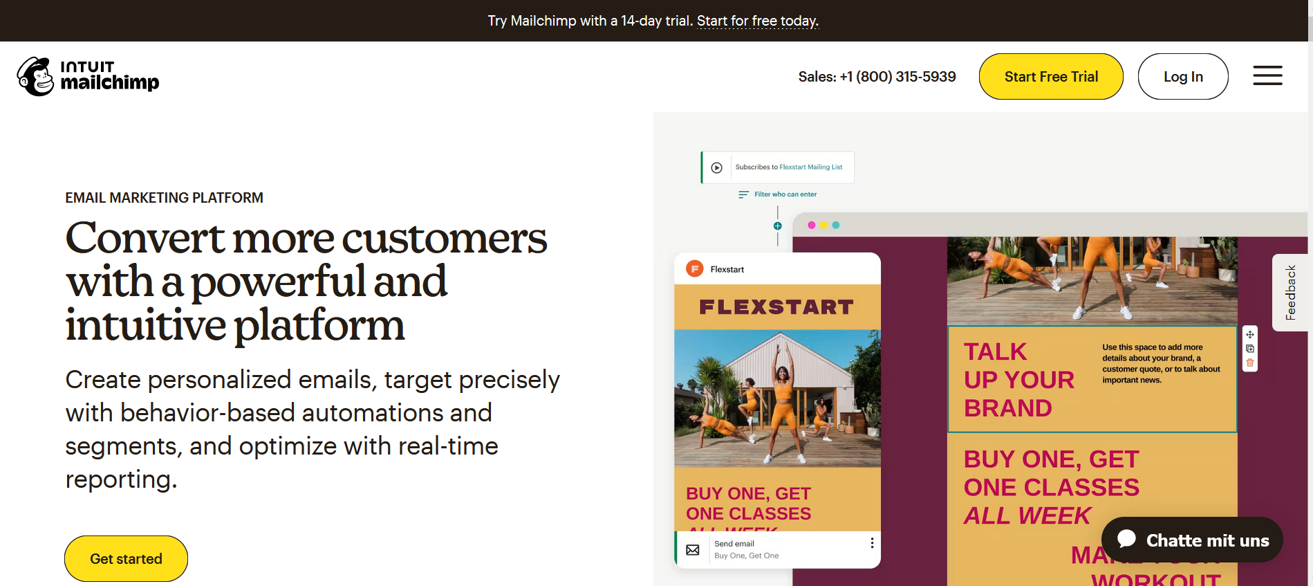 MailChimp propose une offre d’essai : l’utilisation de la solution d’emailing est gratuite pour 1 000 emails par mois à un maximum de 500 destinataires. Avec ce tarif gratuit, l’utilisateur doit toutefois renoncer à des fonctionnalités utiles telles que la planification des emails ou les tests A/B. Le plan « Essentials », disponible à partir de 11,95 € (500 contacts), offre un outil plus complet pour les campagnes d’emailing grâce à la fonction de planification intégrée. Des possibilités d’automatisation sont disponibles avec le plan « Standard » à partir de 18,39 € par mois (500 contacts) ou avec le plan « Premium » à partir de 321,74 € par mois (10 000 contacts). En optant pour des paiements mensuels supplémentaires, vous avez également la possibilité d’ajouter davantage de contacts à votre liste.