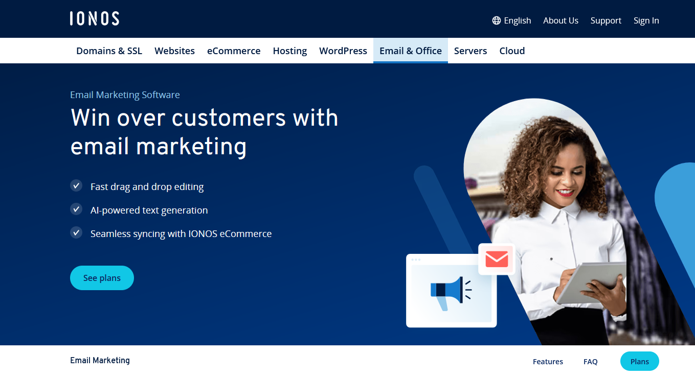 IONOS offre également à ses clients l’outil Email marketing. Cette solution professionnelle est adaptée à toutes les PME et aux spécialistes en marketing. Grâce à l’éditeur de newsletter intuitif, les utilisateurs moins expérimentés peuvent aussi créer leurs premières campagnes d’emailing et newsletters en très peu de temps. Utilisez le glisser-déposer pour déplacer les espaces d’éléments de texte et d’image ainsi que les boutons call-to-action à la position souhaitée. Vous pourrez ensuite ajouter facilement votre propre contenu ! De plus, il existe des modèles de conception prêts à l’emploi pour votre E-commerce, pour annoncer un événement et bien d’autres usages. Ces derniers ont l’avantage d’être conçus de manière responsive et d’être donc optimisés pour toutes les tailles d’écran. Toutes les données sont stockées dans des data centers situés en Allemagne, de sorte que l’outil de newsletter est non seulement protégé par le chiffrement SSL et la protection DDoS, mais aussi conforme aux directives de protection des données de la RGPD. Et si vous êtes à court d’idées pour rédiger vos emails, vous pouvez confier cette tâche au générateur de texte par IA de IONOS !