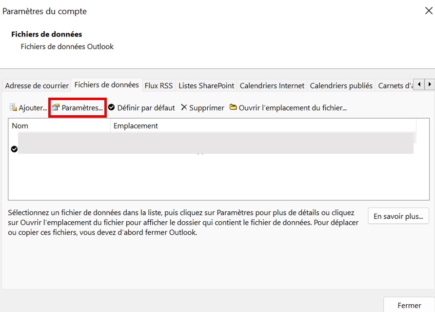 Dans la configuration de l’email, sélectionnez l’option « Fichiers de données ». Un menu s’affiche alors, dans lequel sont répertoriés tous les fichiers de données Outlook actuellement disponibles. Cliquez sur le fichier PST souhaité et appuyez ensuite sur « Paramètres… ».