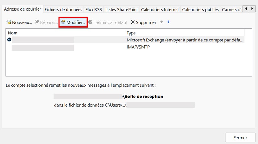 Dans la configuration de l’email, sélectionnez l’option « Comptes de courrier ». Outlook vous présente alors tous les comptes email que vous avez associés au client Microsoft. Cliquez sur le compte dont vous souhaitez modifier le mot de passe, puis appuyez sur « Modifier » :