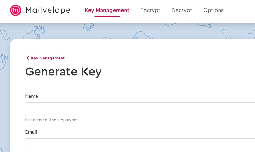 Une fois l’extension installée, une fenêtre contextuelle apparaît. Cliquez sur « Get Started » pour démarrer la configuration. Vous serez alors redirigé directement vers le gestionnaire de clés, qui ne contient logiquement pas encore une paire de clés pour le chiffrement d’emails. Pour ce faire, cliquez sur « Generate Key », puis saisissez les informations requises :