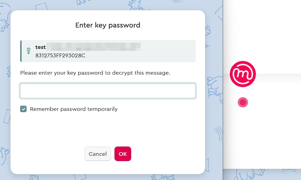 Si vous sélectionnez l’option « Upload public key to Mailvelope Key Server », les partenaires de contact peuvent l’obtenir à partir de là pour vous envoyer également des emails chiffrés. Dès que la paire de clés PGP a été générée, vous recevez alors un message de confirmation ainsi qu’un premier email chiffré, que Mailvelope envoie à l’adresse email indiquée. Ouvrez le message puis cliquez sur l’icône au centre (« Show message »), puis entrez le mot de passe de la clé générée précédemment.