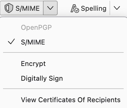 - Lorsque vous rédigez un email, vous pouvez activer ou désactiver les options via le bouton S/MIME dans la barre d’outils, et choisir si vous souhaitez utiliser S/MIME pour le chiffrement, la signature ou les deux.