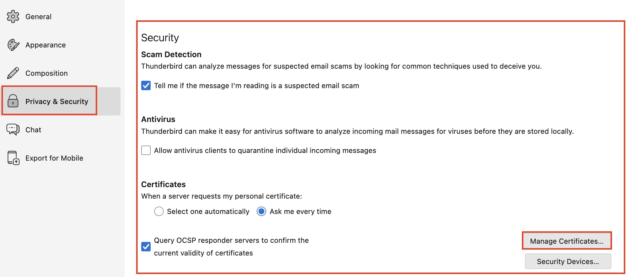 - Après avoir obtenu votre certificat auprès d’un fournisseur, ouvrez Thunderbird et accédez aux Paramètres. Dans le menu « Vie privée et sécurité », cliquez sur « Certificats », puis sur « Gérer les certificats ».