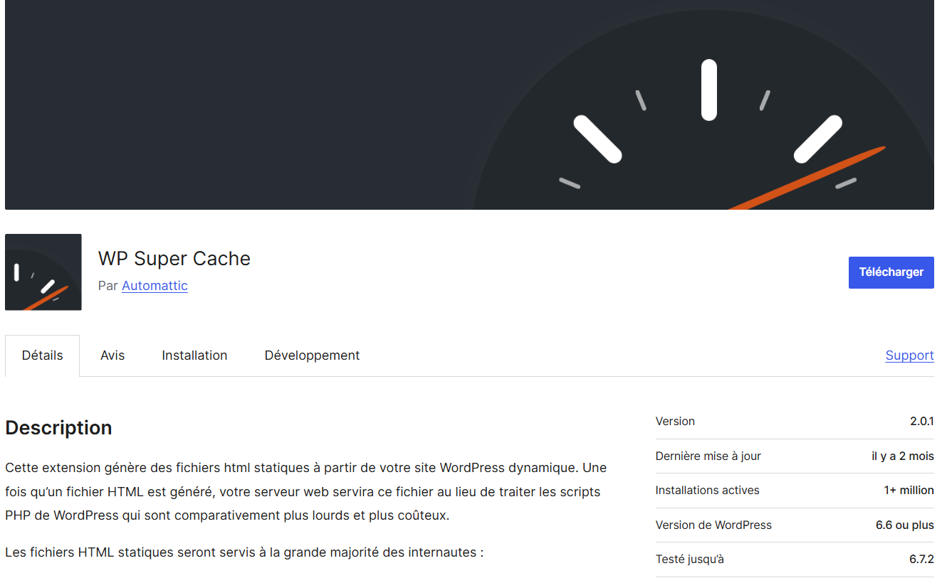 Le plugin WP Super Cache est développé par l’entreprise responsable de WordPress, ce qui explique pourquoi les utilisateurs du CMS le considèrent comme le plugin de cache officiel pour WordPres. Le grand point fort de ce plugin, c’est la création de pages HTML statiques. Ainsi, lorsqu’il ne lit pas des données sur la base de données, le navigateur affiche les pages nettement plus vite.