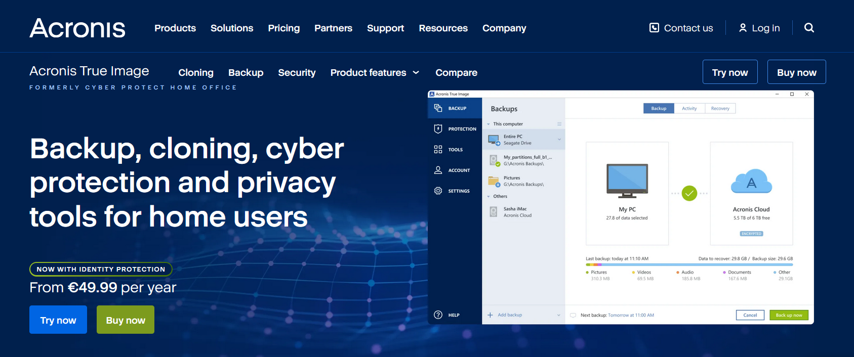 Acronis propose un logiciel de sauvegarde pour les particuliers qui vous permet d’organiser la sauvegarde personnelle en ligne sur le Cloud du fournisseur ainsi que le stockage local. Entre 500 Go et 5 To sont disponibles en fonction de votre abonnement. L’entreprise applique ainsi la règle de sauvegarde 3-2-1 : un triple stockage de toutes les données sur deux technologies différentes, dont l’une doit être externe. Pour les entreprises, Acronis propose même des solutions sur site qui peuvent être utilisées en combinaison avec un service hybride de restauration après sinistre, par exemple.