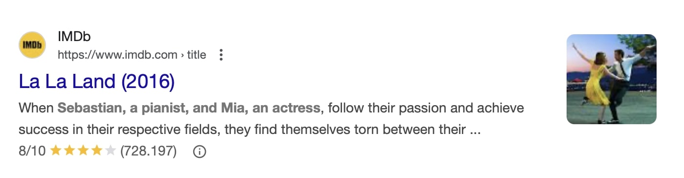 Les évaluations par étoiles sur un site Internet offrent un avantage supplémentaire : grâce au balisage conforme à schema.org, elles peuvent apparaître dans les SERP de Google sous forme de rich snippets. Ces extraits attirent l’attention avant même que l’utilisateur ne visite votre page et peuvent ainsi générer davantage de trafic. Dans l’exemple ci-dessous, le film « La La Land », récompensé par six Oscars, a été recherché sur Google. Les SERP affichent l’entrée de l’Internet Movie Database (IMDb) avec la note moyenne des utilisateurs sur une échelle de 1 à 10, une représentation graphique sous forme d’étoiles ainsi que le nombre total de votes exprimés :